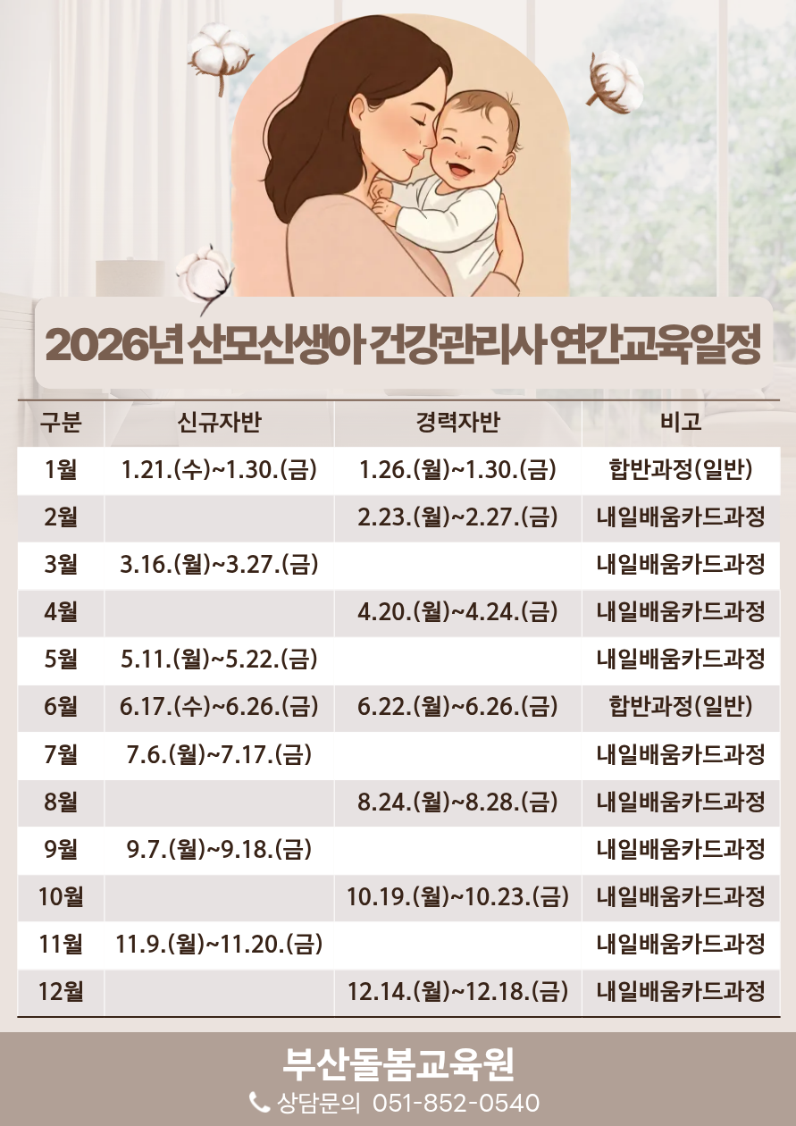 2026년도 연간 교육일정이 드디어 공개되었습니다.👏산모신생아 건강관리사 양성과정은 내일배움카드 및 일반과정 모두 운영됩니다.